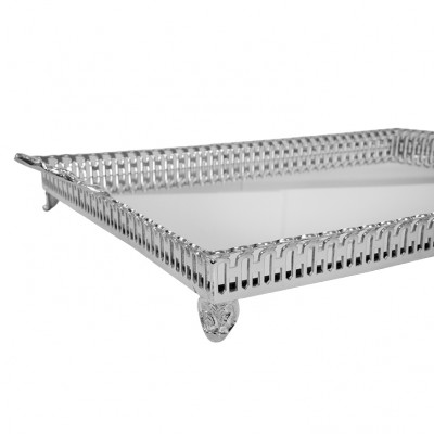 Bandeja de Prata Retangular c/ grade alça espelho 40x30cm, é fabricada em Prata Apolo de altíssima qualidade, é muito utilizada onde servir com sofisticação e requinte é fundamental.