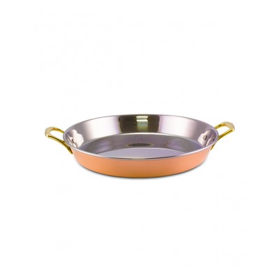 Paellera com duas alças - Ø44cm x 5cm alt. fabricada em cobre Apolo com revestimento aço inox de altíssima qualidade, mantendo assim suas características originais e preservando o seu requinte, elegância e brilho por muito mais tempo. Seus detalhes valorizam em muito a peça, seu design proporciona beleza, praticidade e um toque de sofisticação ao ambiente a ele destinado.