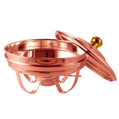 Rechaud Redondo em Cobre Banho Maria com Cuba Porcelana 4 Litros, é fabricado em Cobre Apolo de excelente qualidade, proporcionando durabilidade e características originais por muito mais tempo. Muito utilizado em Buffet, Restaurante, Hotel e também no uso doméstico, onde servir com requinte é fundamental.