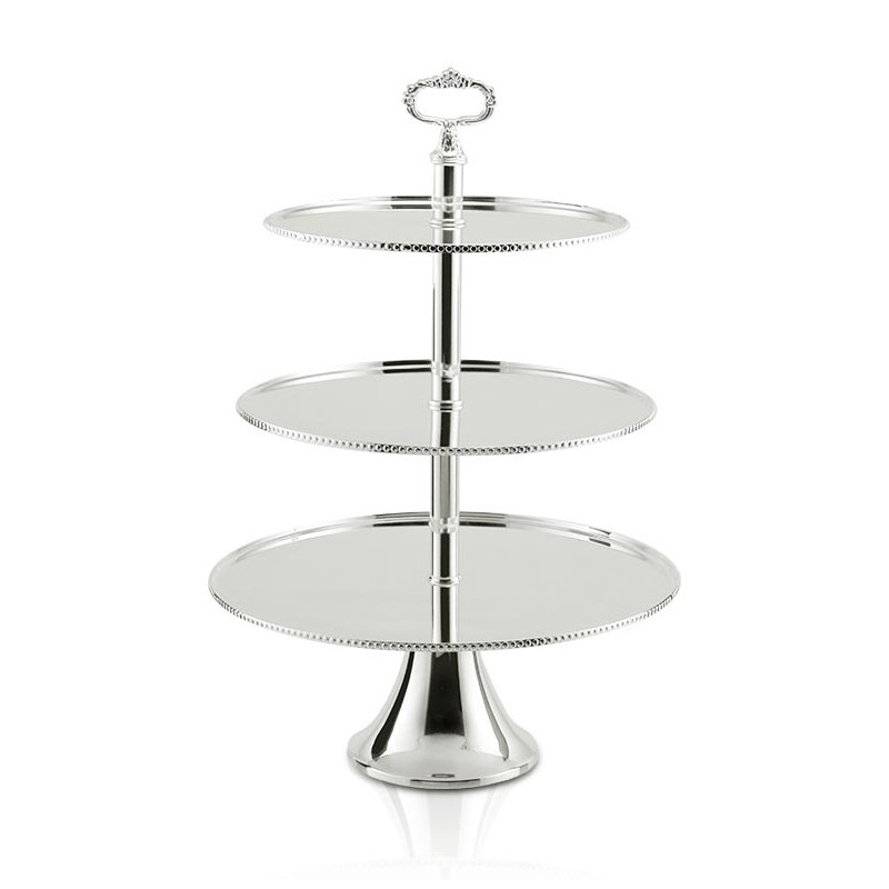 Doceira 3 andares pérola 60 alt, pratos de Ø40cm / Ø35cm / Ø30cm fabricada em Prata Apolo de altíssima qualidade, mantendo assim suas características originais e preservando o seu requinte, elegância e brilho por muito mais tempo. Seus detalhes valorizam em muito a peça, seu design proporciona beleza, praticidade e um toque de sofisticação ao ambiente a ele destinado.