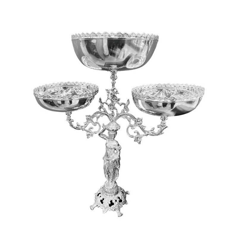 Fruteira Deusa Afrodite com bacia prata - Ø25cm / Ø18cm x 56cm alt.,é fabricada em Prata Apolo de altíssima qualidade, mantendo assim suas características originais e preservando o seu requinte, elegância e brilho por muito mais tempo.